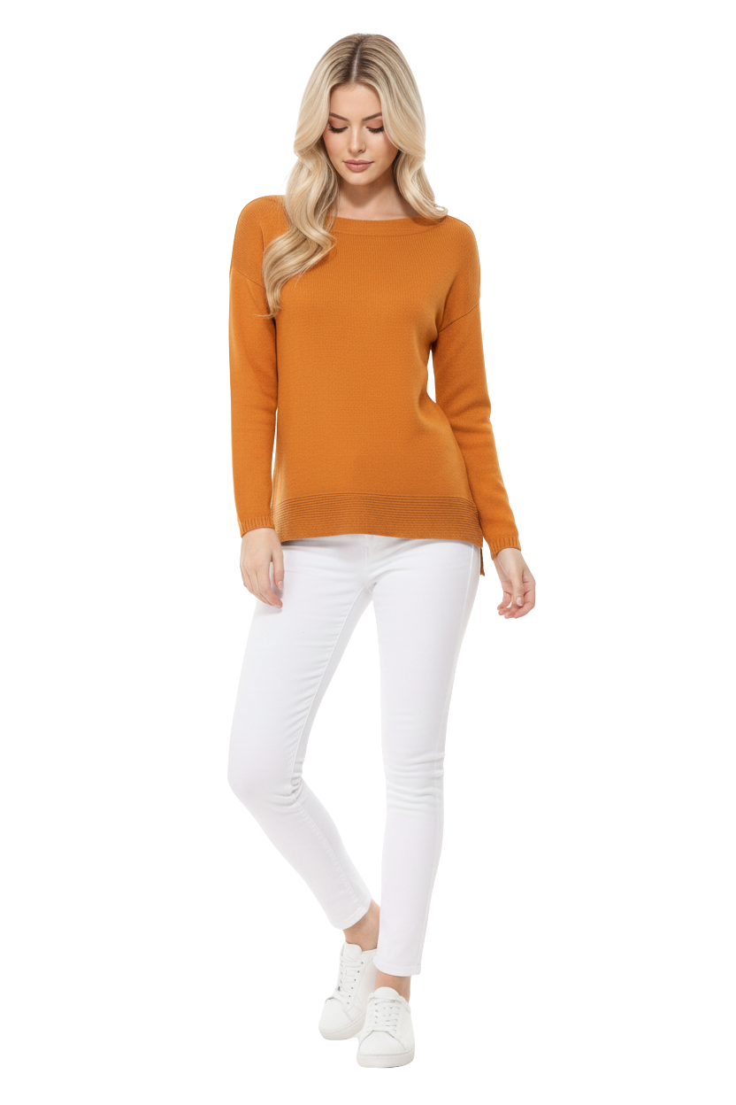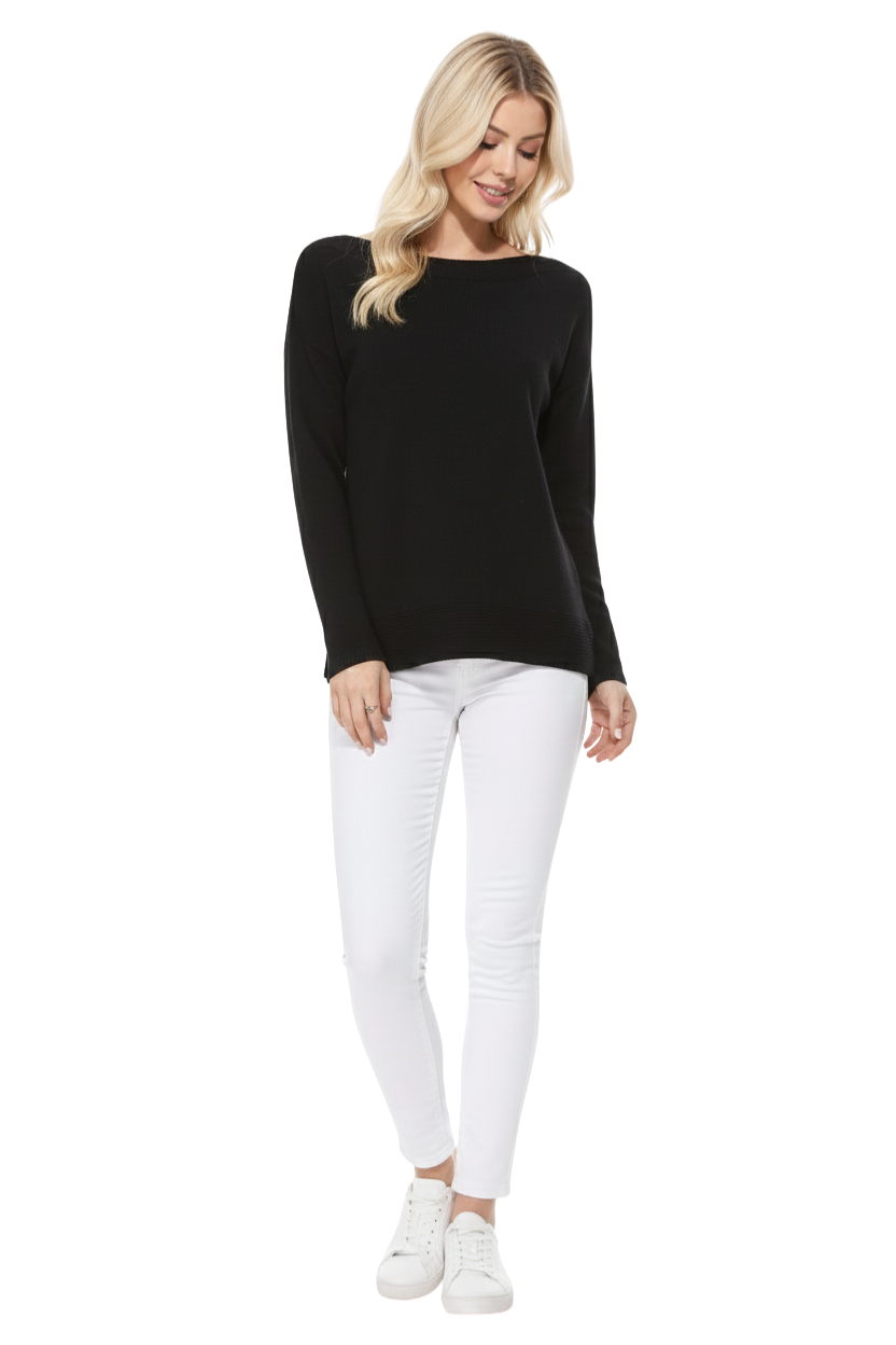 21"-22" Length, Silky Soft Stretch Knit, Long Sleeve, Boat Neck, Casual Sweater Top with Ribbing at Collar, Hems, and Cuffs