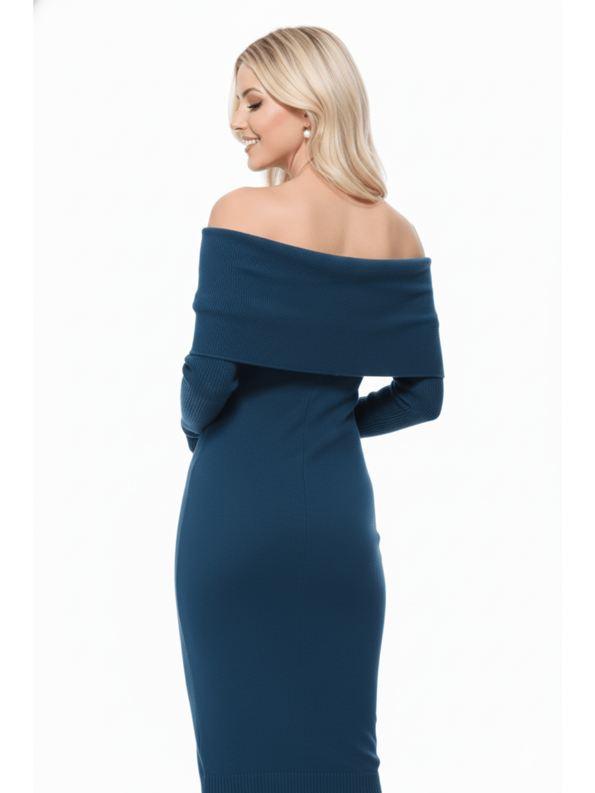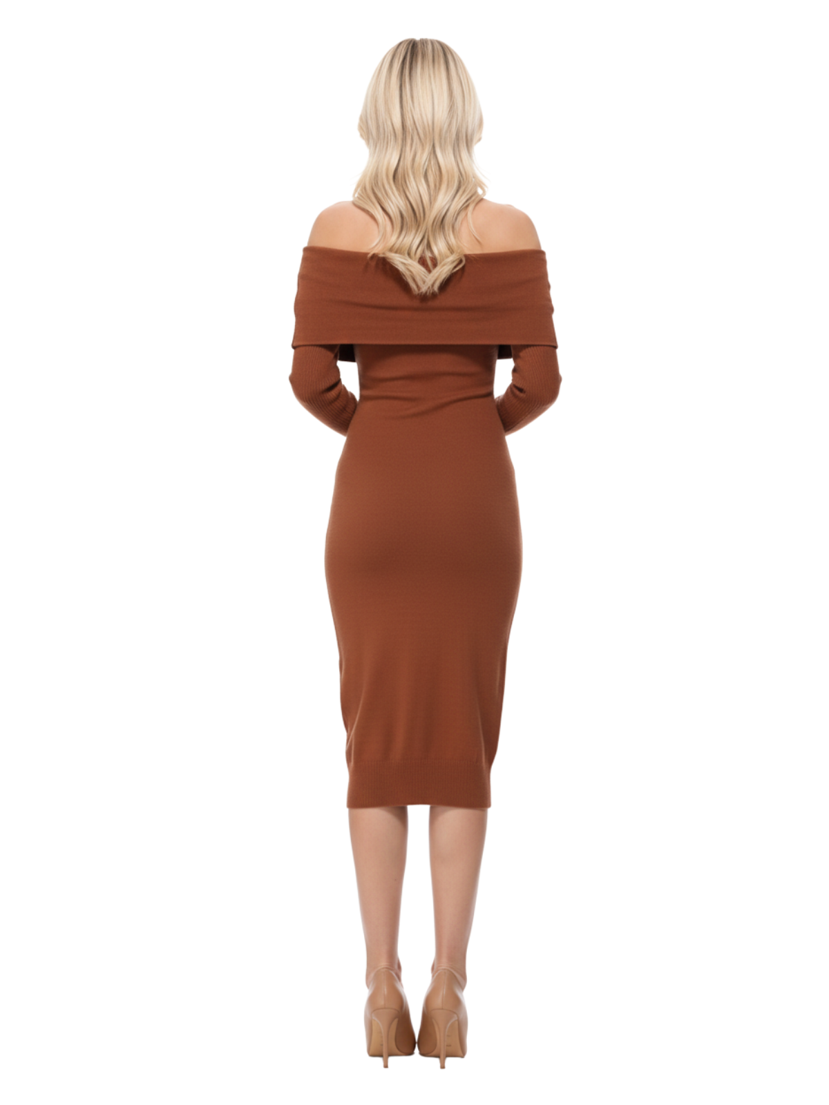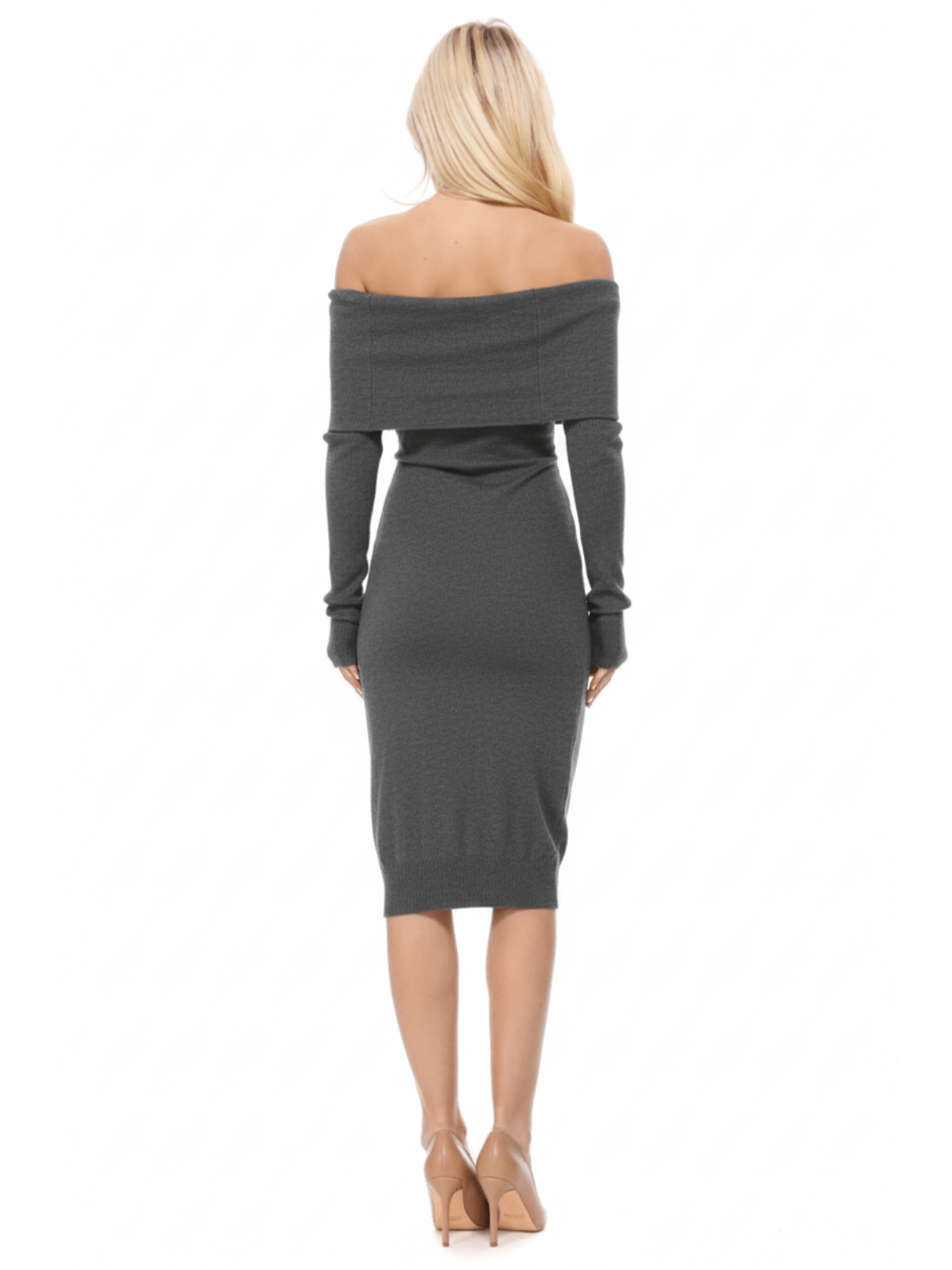 Yemak Women's Off Shoulder Long Sleeve Slim Fit Midi Knit Dress MK6022
