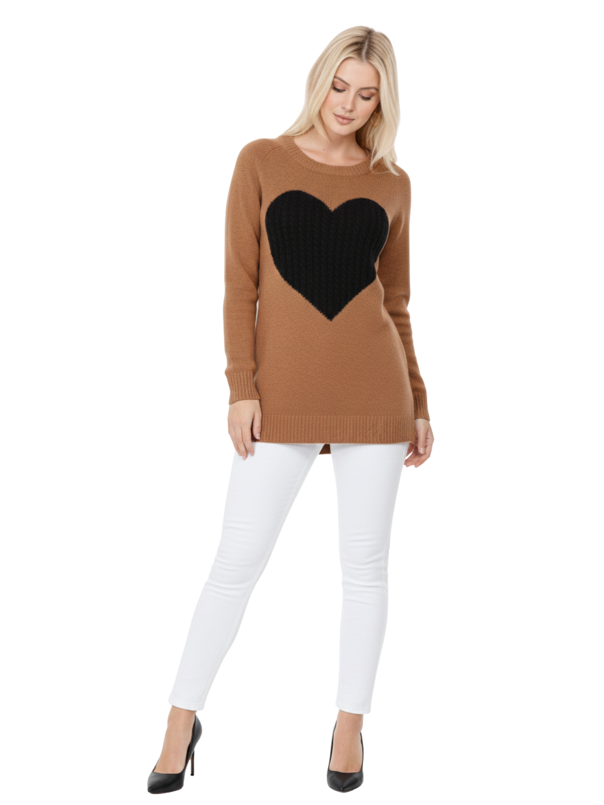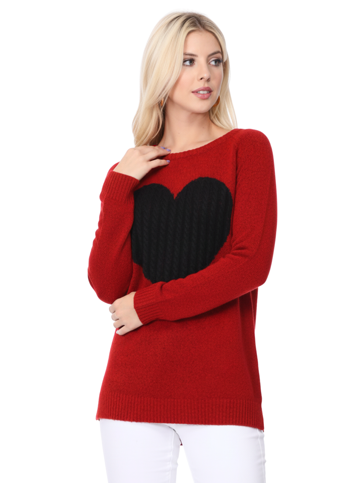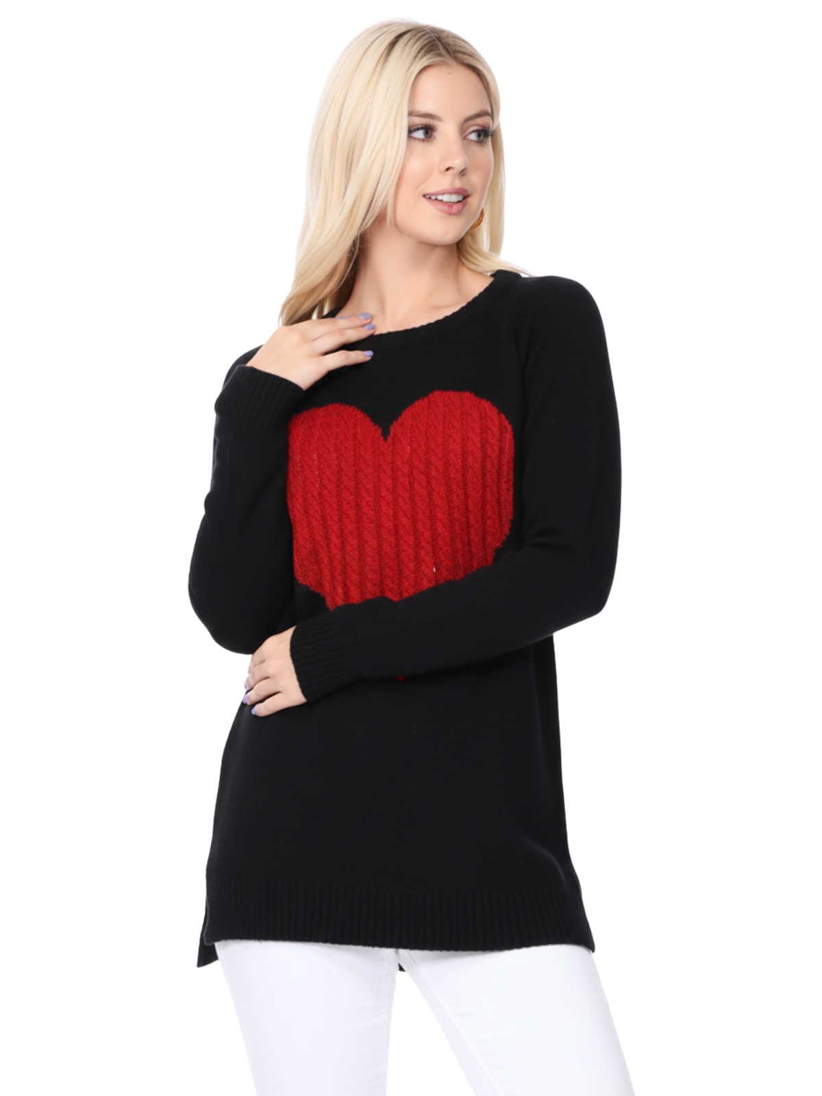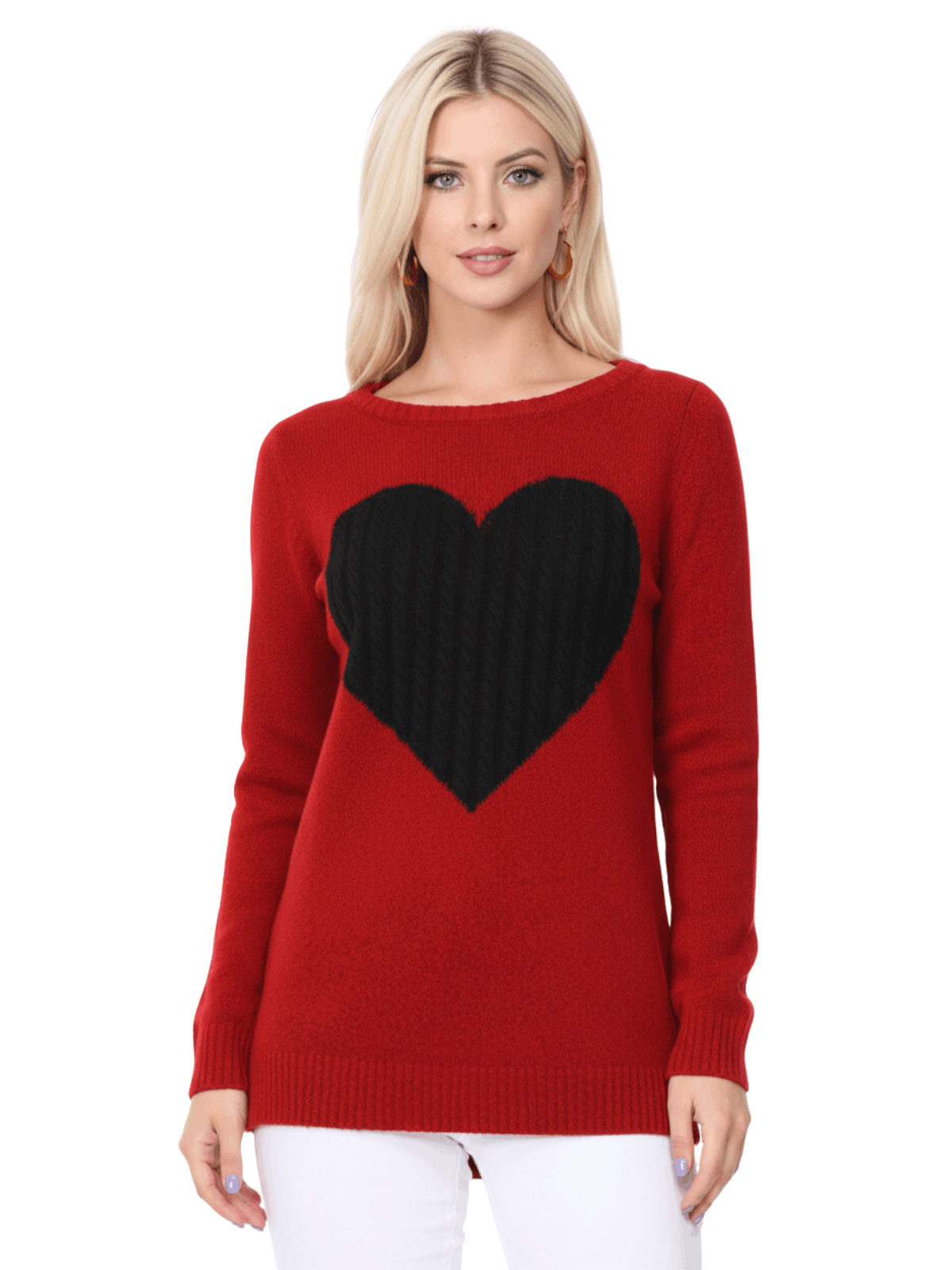 - 26" - 27" Length, Crewneck, Long Sleeve, Heart Design Knit Pullover Sweater.