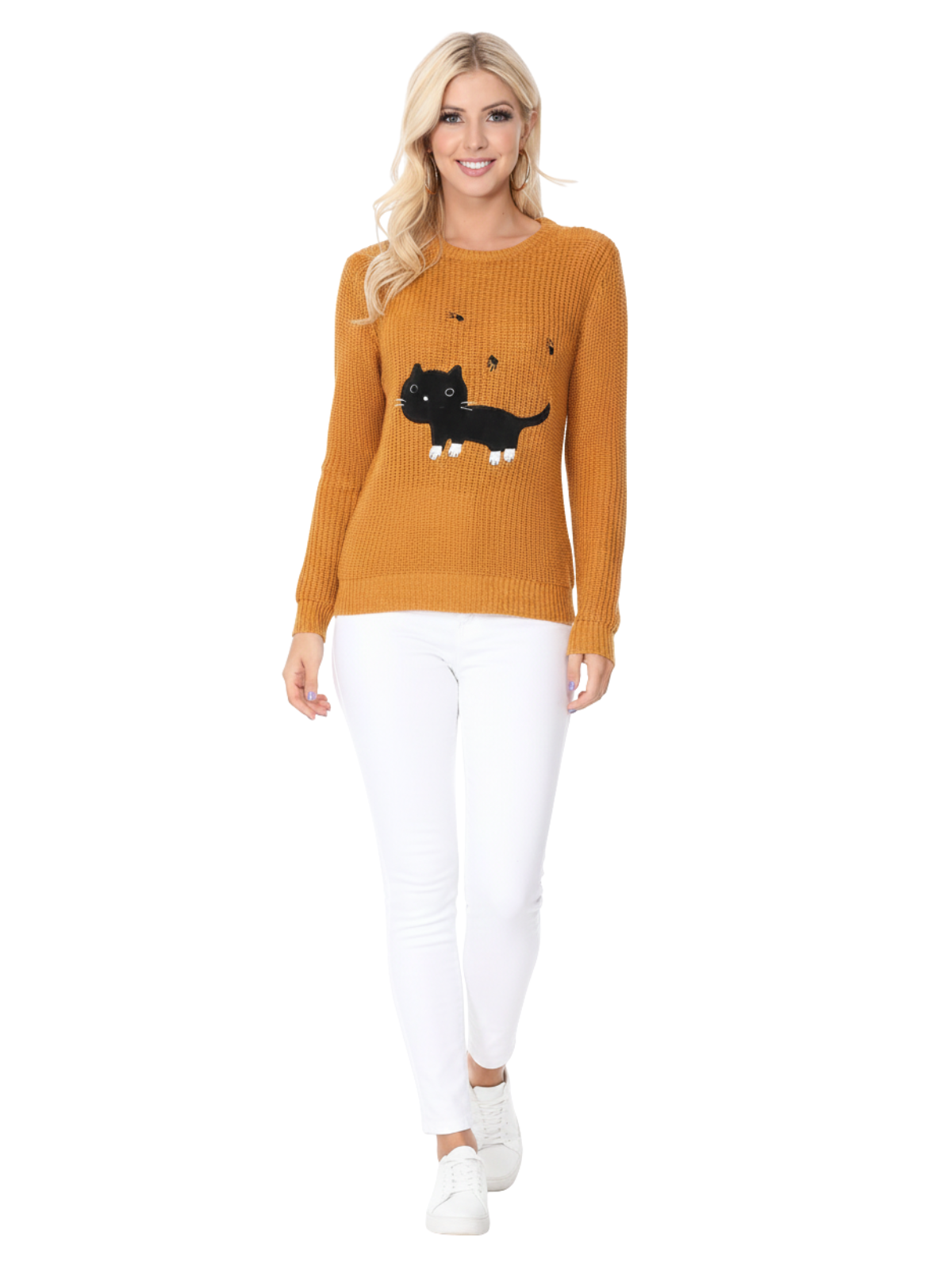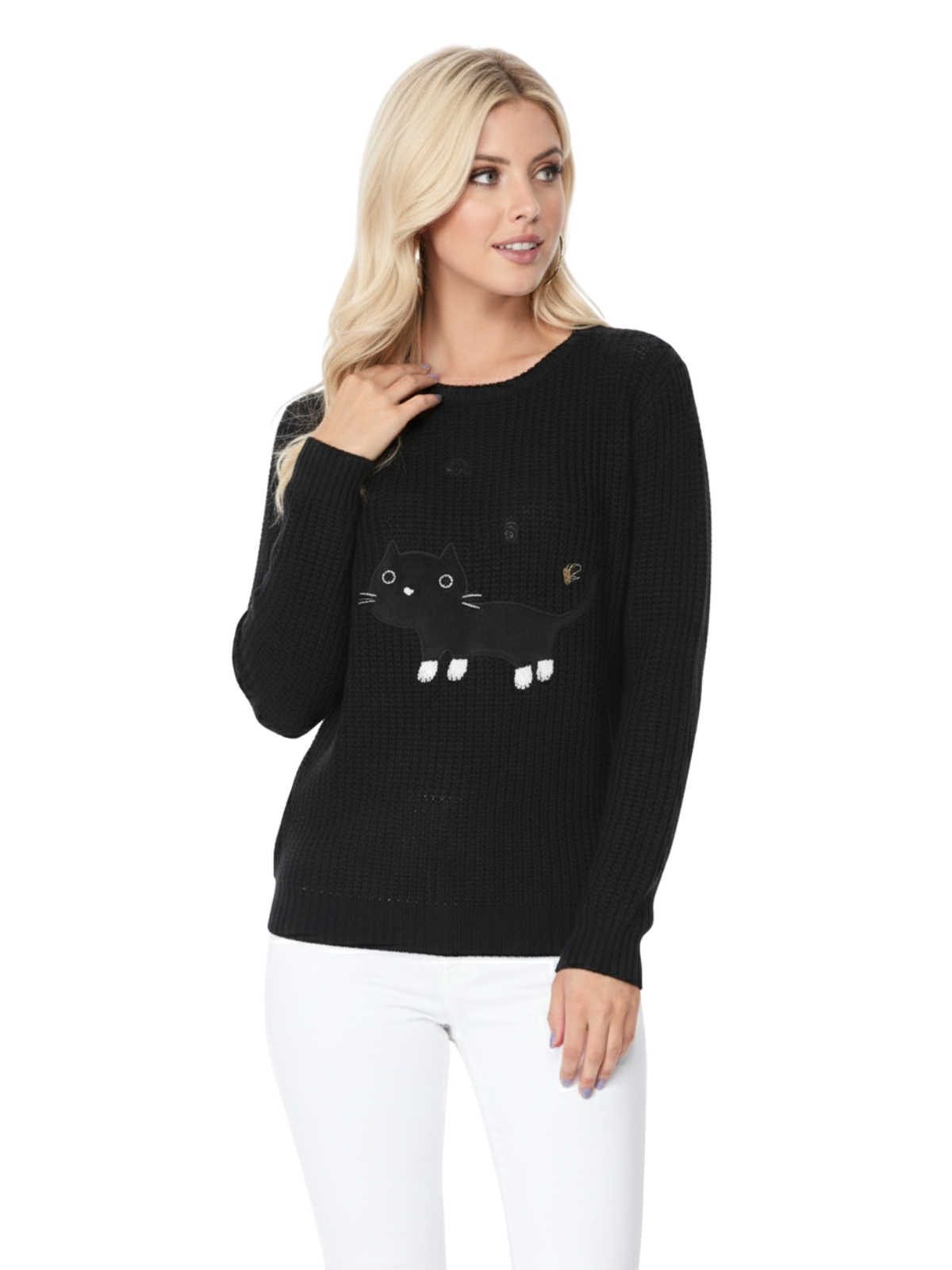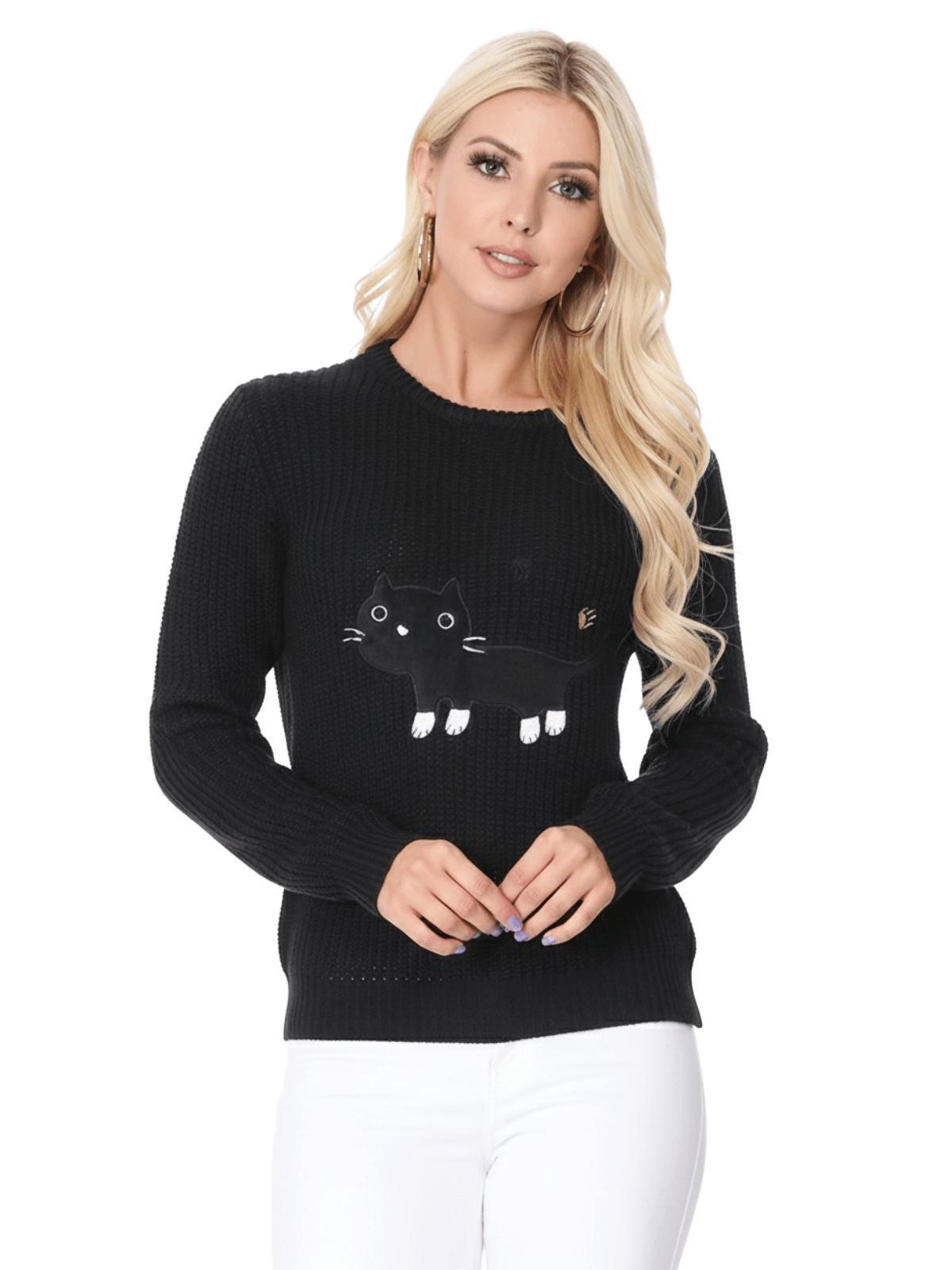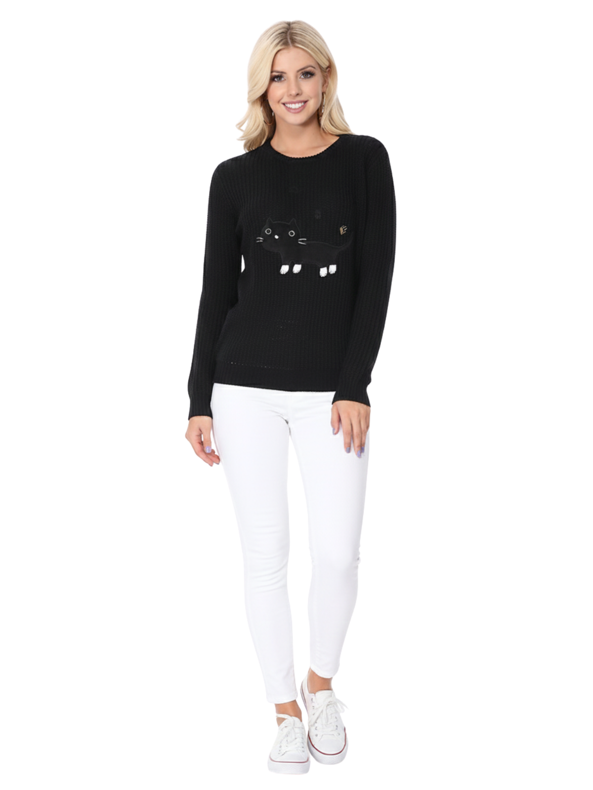 YEMAK Women's Black Cat Applique Crewneck Long Sleeve Casual Knit Pullover Sweater MK8207