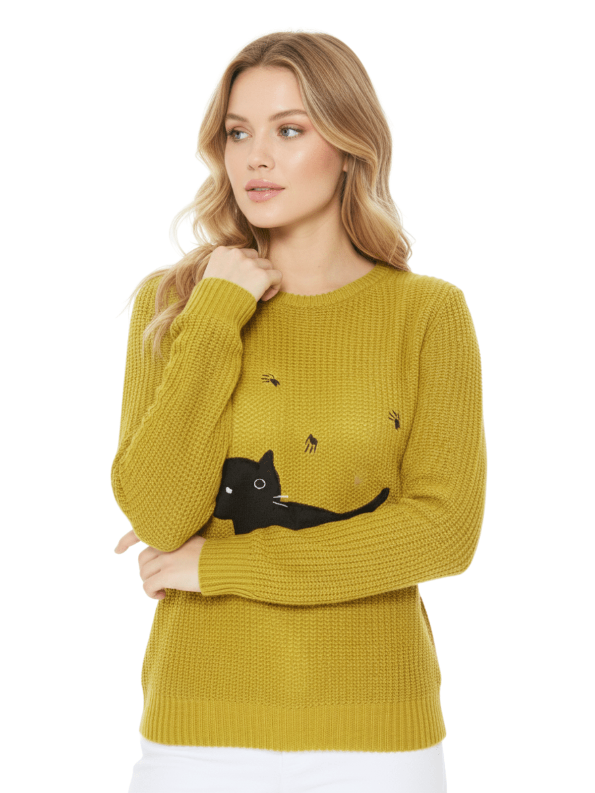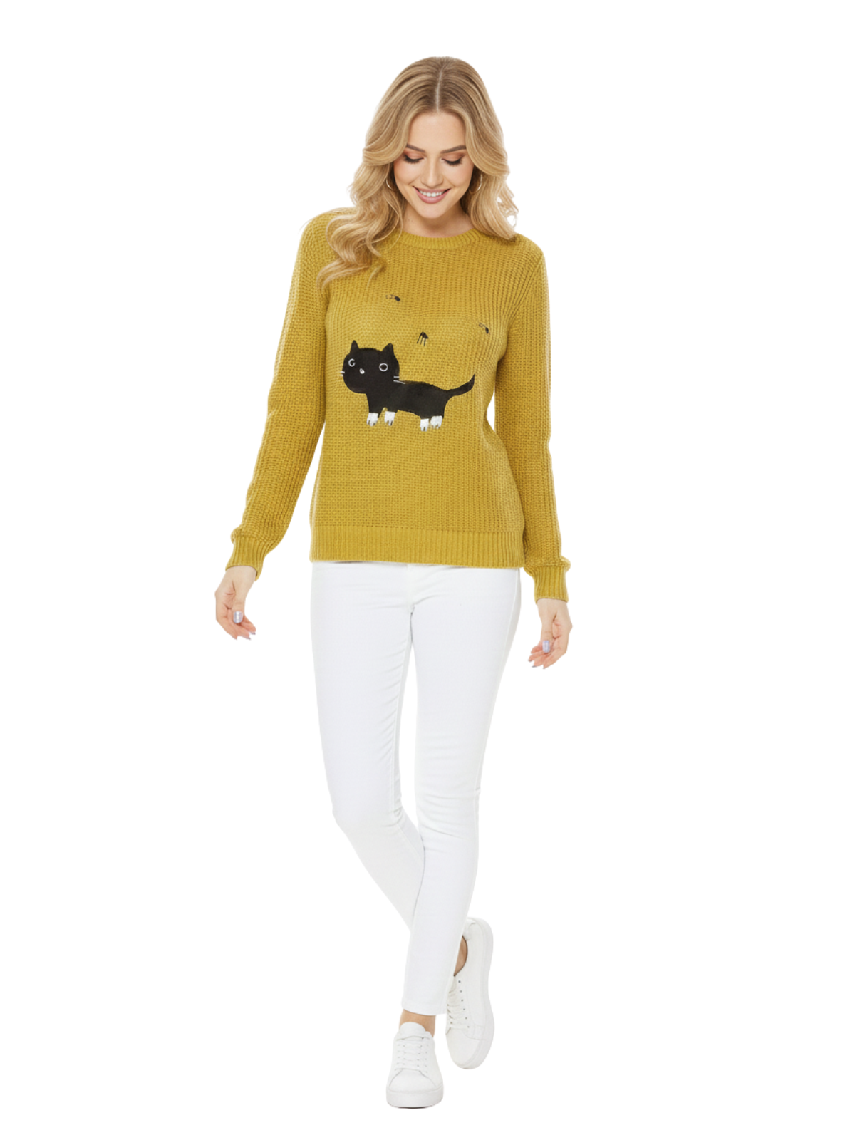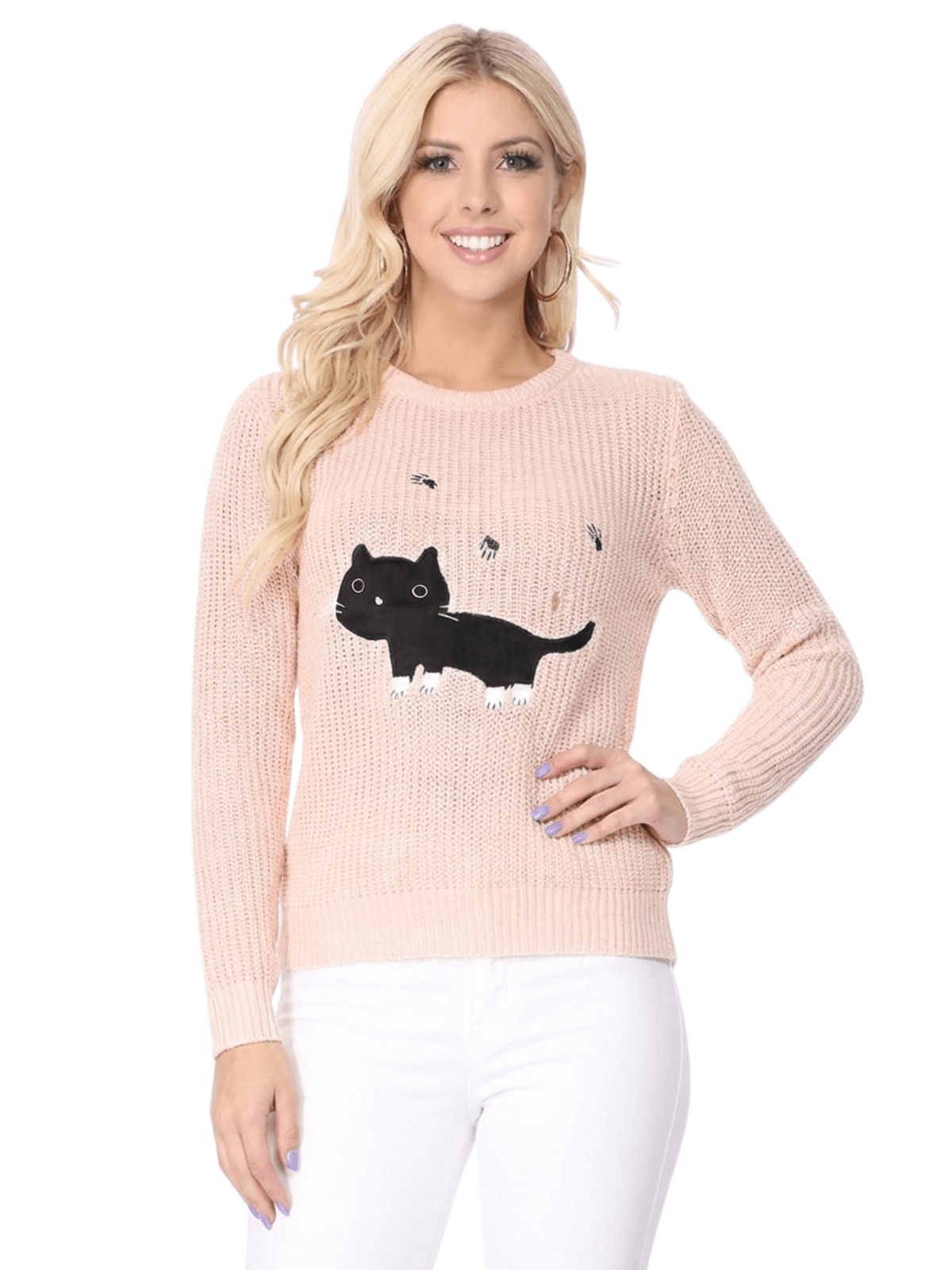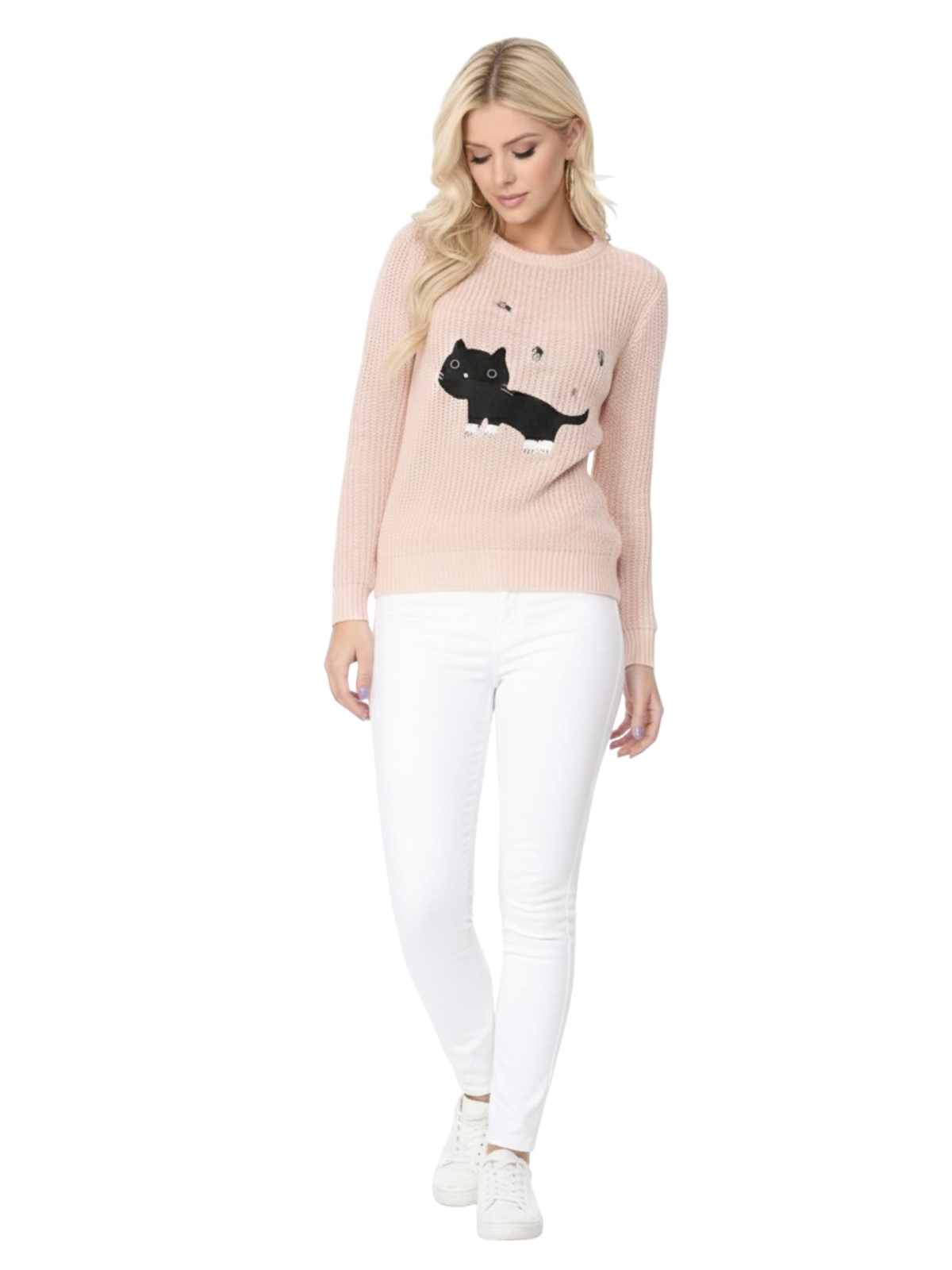 YEMAK Women's Black Cat Applique Crewneck Long Sleeve Casual Knit Pullover Sweater MK8207