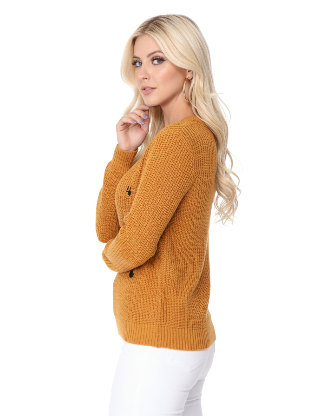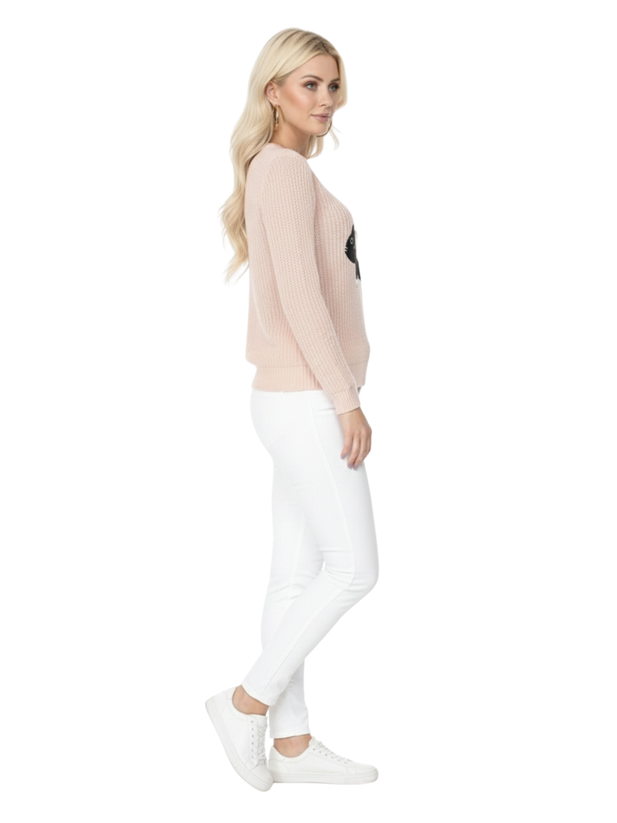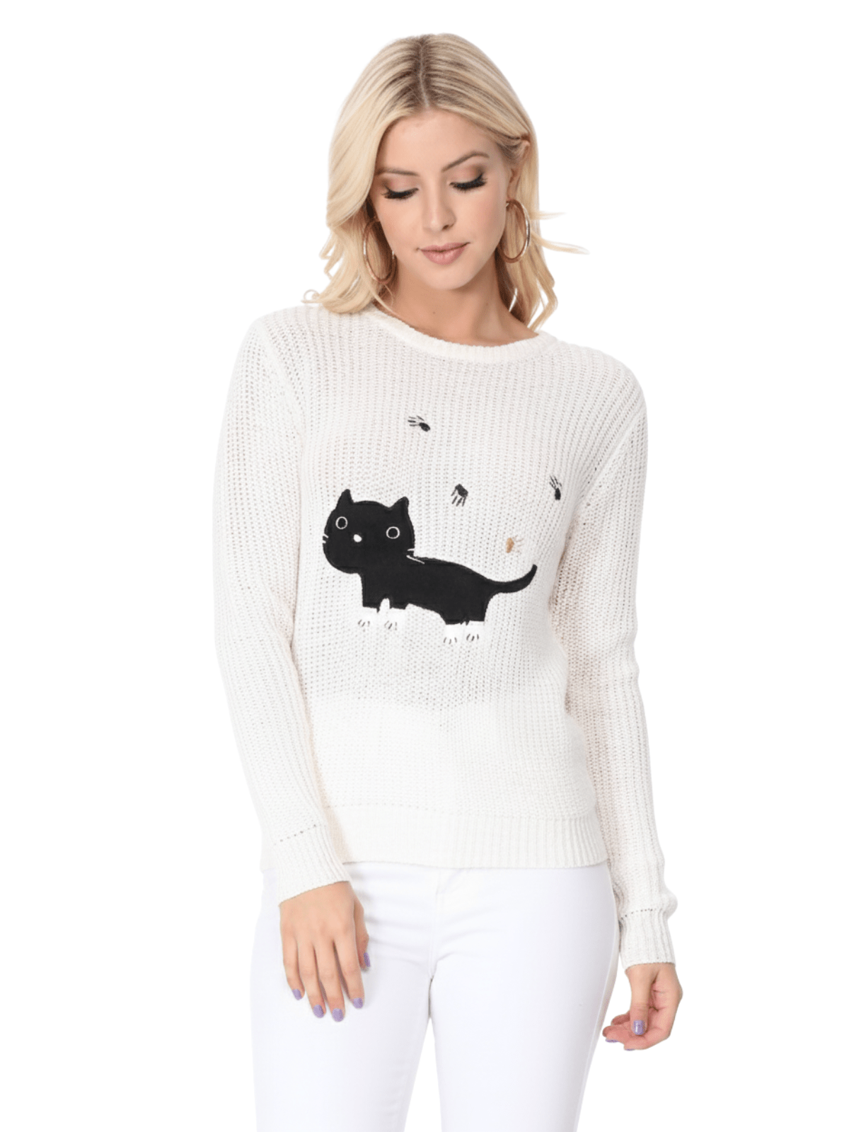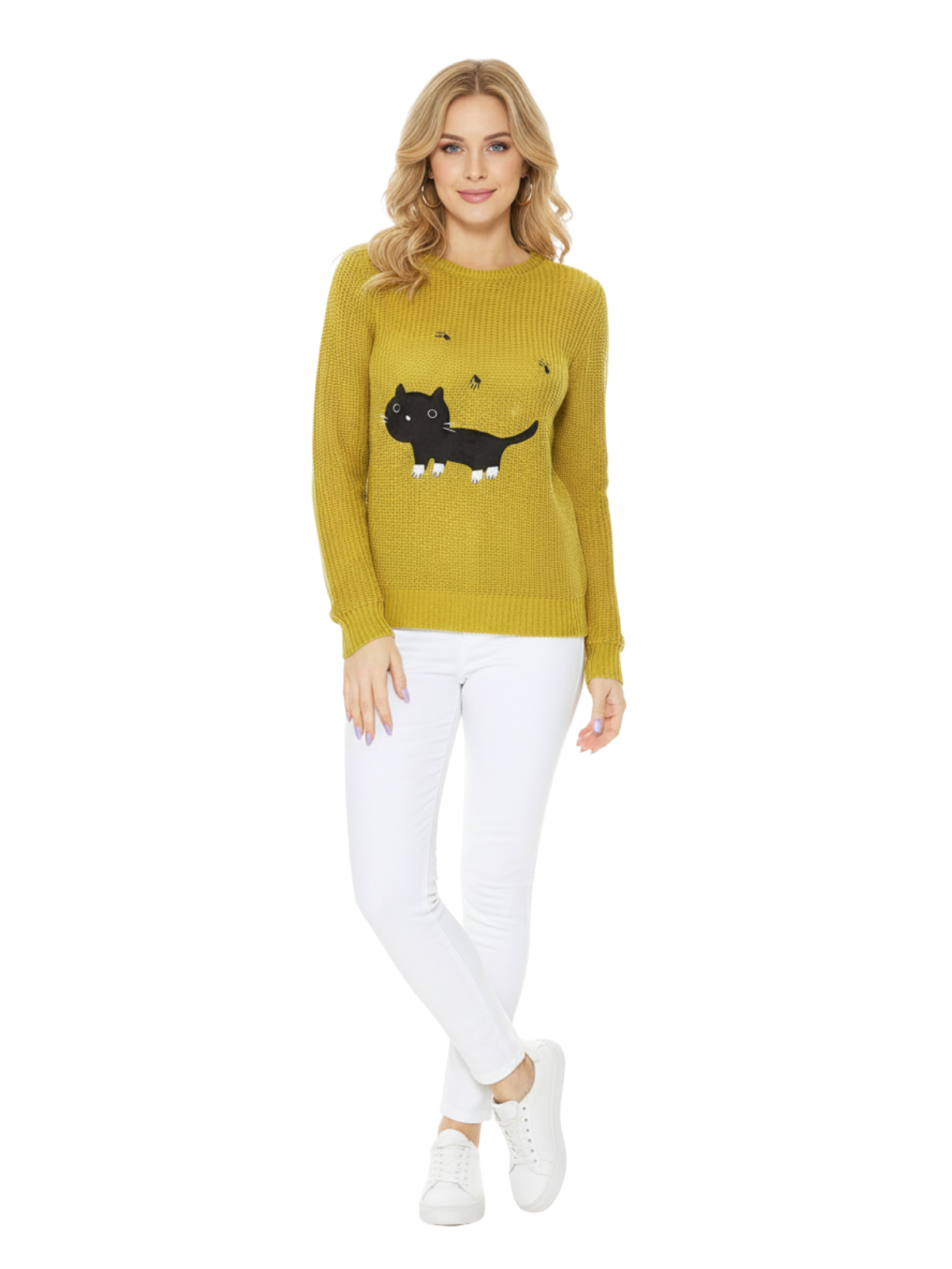 YEMAK Women's Black Cat Applique Crewneck Long Sleeve Casual Knit Pullover Sweater MK8207