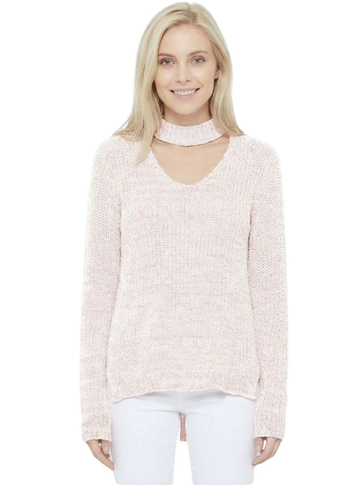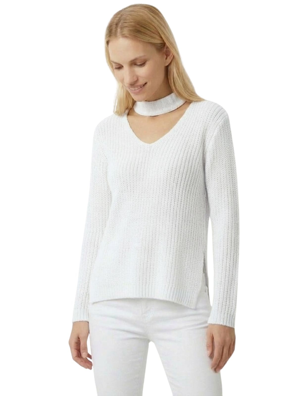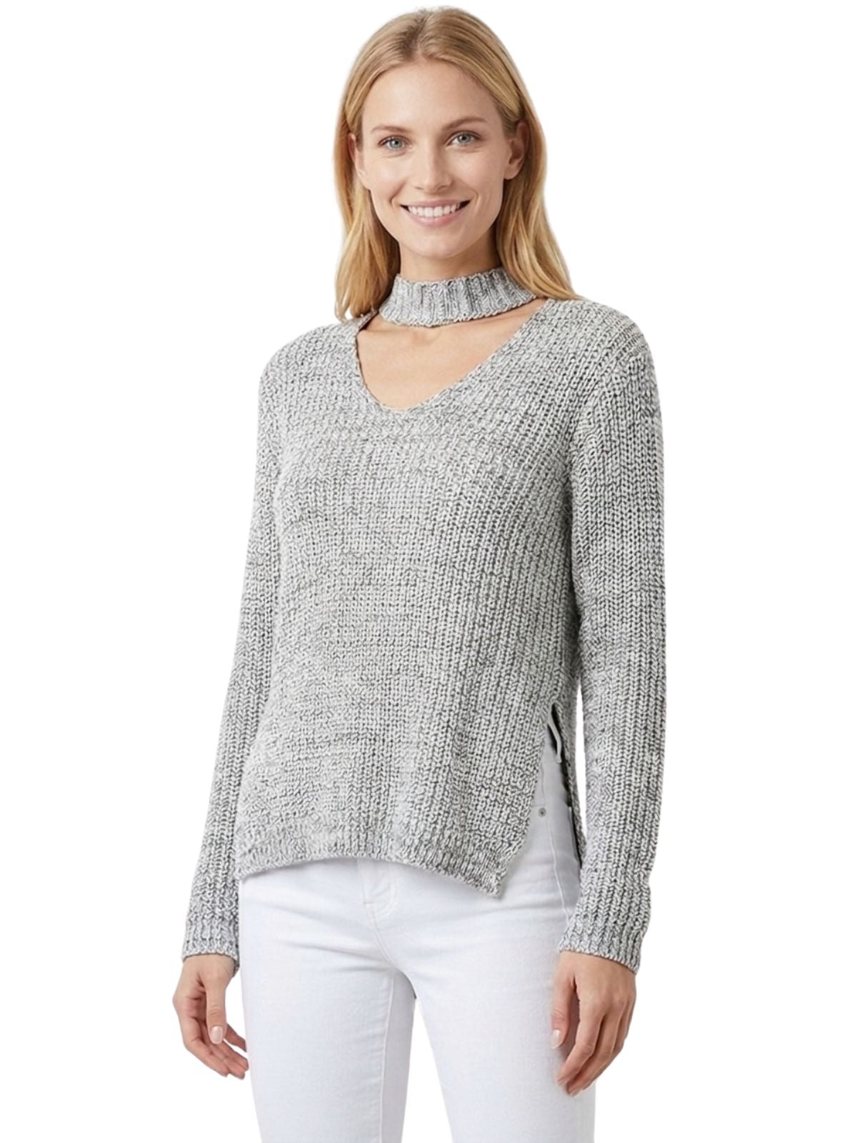 YEMAK Women's V-Neck Choker Style Side Slit Casual Knit Pullover Sweater MK8143